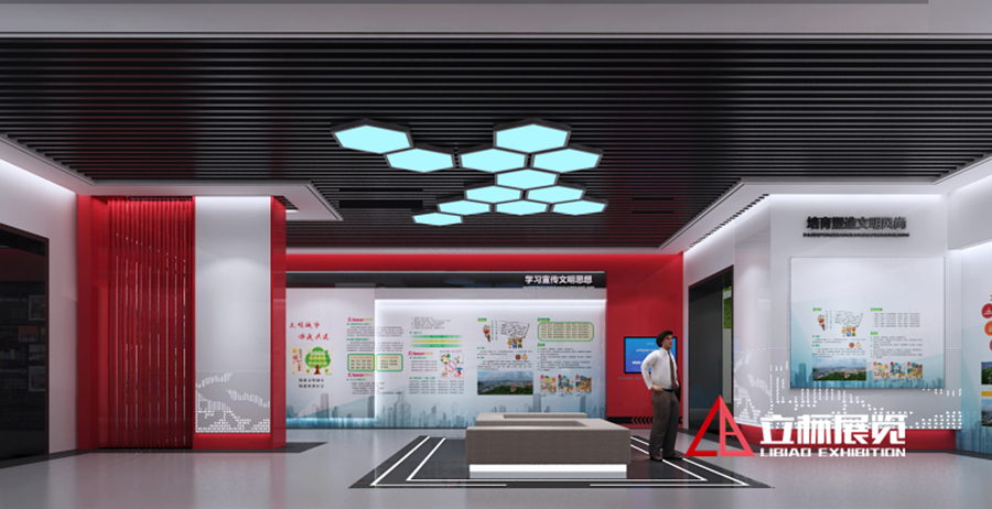 空間處理上注重每個(gè)部分之間的內(nèi)在聯(lián)系,使展示內(nèi)容和空間環(huán)境融洽結(jié)合。造型設(shè)計(jì)突出黨政風(fēng)格的特點(diǎn),注重結(jié)構(gòu)簡(jiǎn)約、造型合理、形式多變,同時(shí)動(dòng)態(tài)影像與靜態(tài)展板交輝呼應(yīng),共同創(chuàng)造出全方位立體化的和諧展示空間。